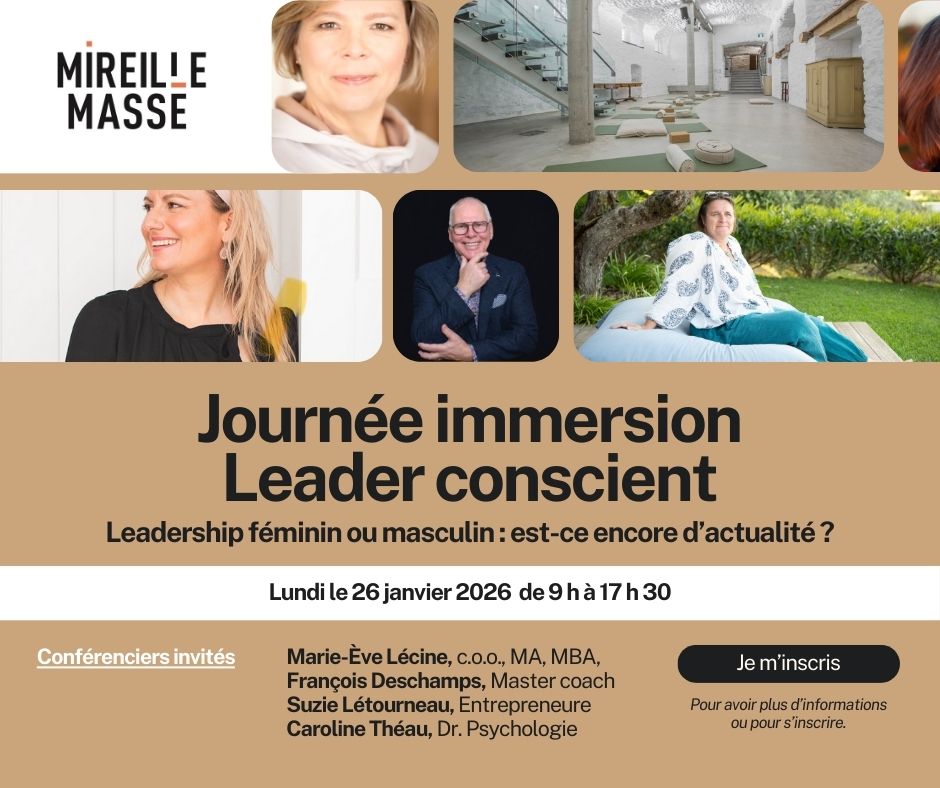 Grâce à son approche profondément humaine et inspirante, Mireille aide les leaders à passer d'un mode ''faire'' à un mode ''être'', leur permettant de s'accomplir tout en performant avec un équilibre renouvelé. Elle partage des outils concrets et puissants, adaptés à la réalité des leaders d'aujourd'hui, et ouvre la voie à des changements durables pour la santé et le bien-être de chacun. »